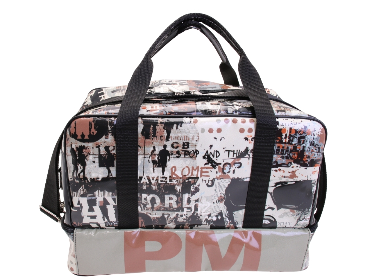 BORSA BAGAGLIO A MANO NERA E BEIGE IN STILE “GRAFFITI” 40 X 20 X 25 CM. MODELLO FLYME IN TELONE CAMION.