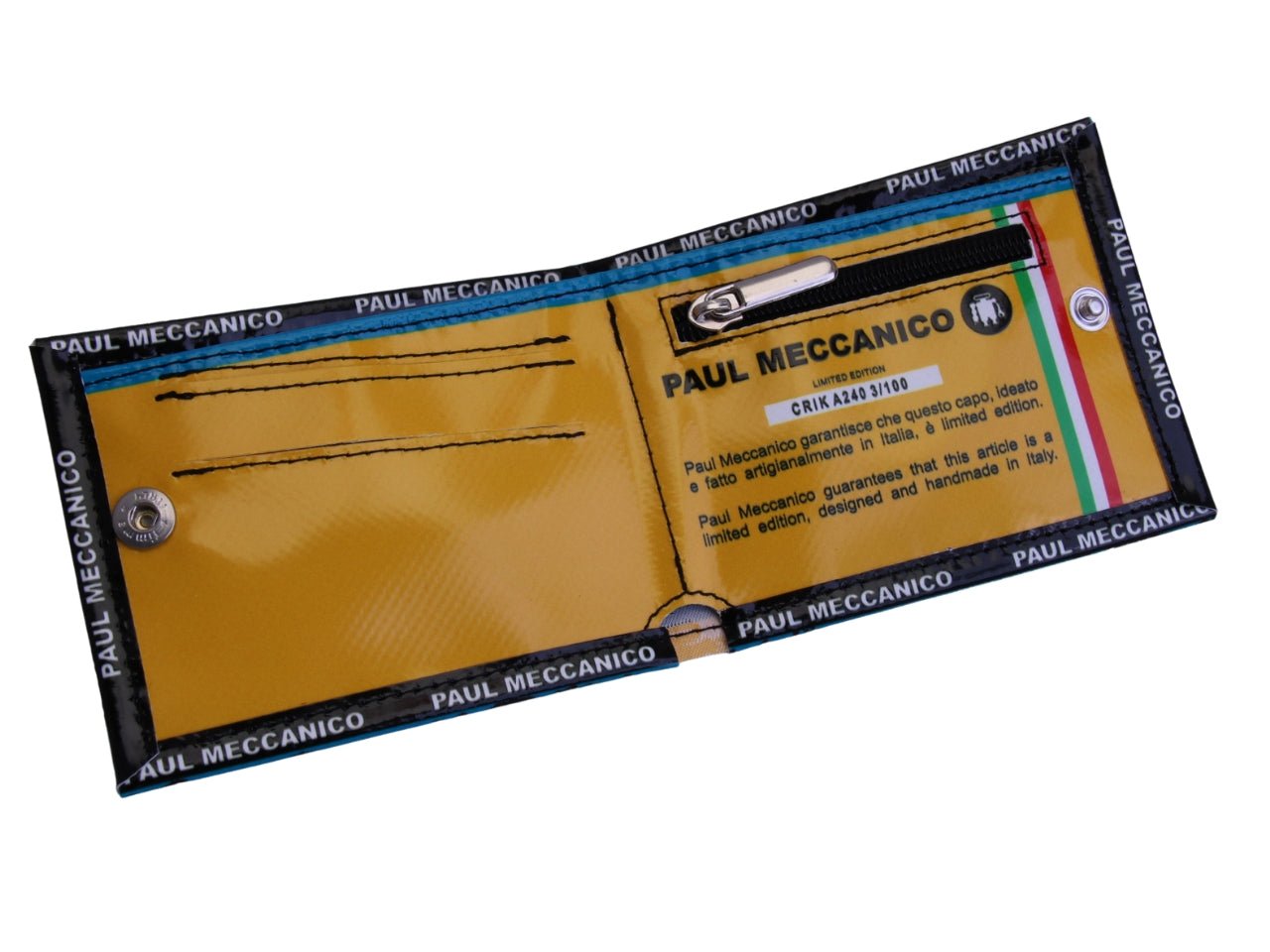 Il CRIK (12 x 9,5 cm chiuso) รจ un portafoglio pieghevole definito dalla sua silhouette sottile e dalla costruzione in telo camion. Progettato per offrire durevolezza ed efficienza, fornisce una dimora impermeabile per contanti e carte in un telaio raffinato e prodotto in piccola serie. Si tratta di un’Edizione Limitata: una ristretta serie numerata, fatta a mano in Italia.