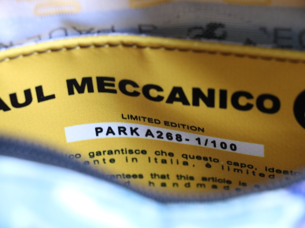Il tuo pezzo è il N.1 su un totale di 100 borse ed è accompagnato da un Certificato di Autenticità firmato che riporta il tuo Codice di Autenticità e il numero di edizione.