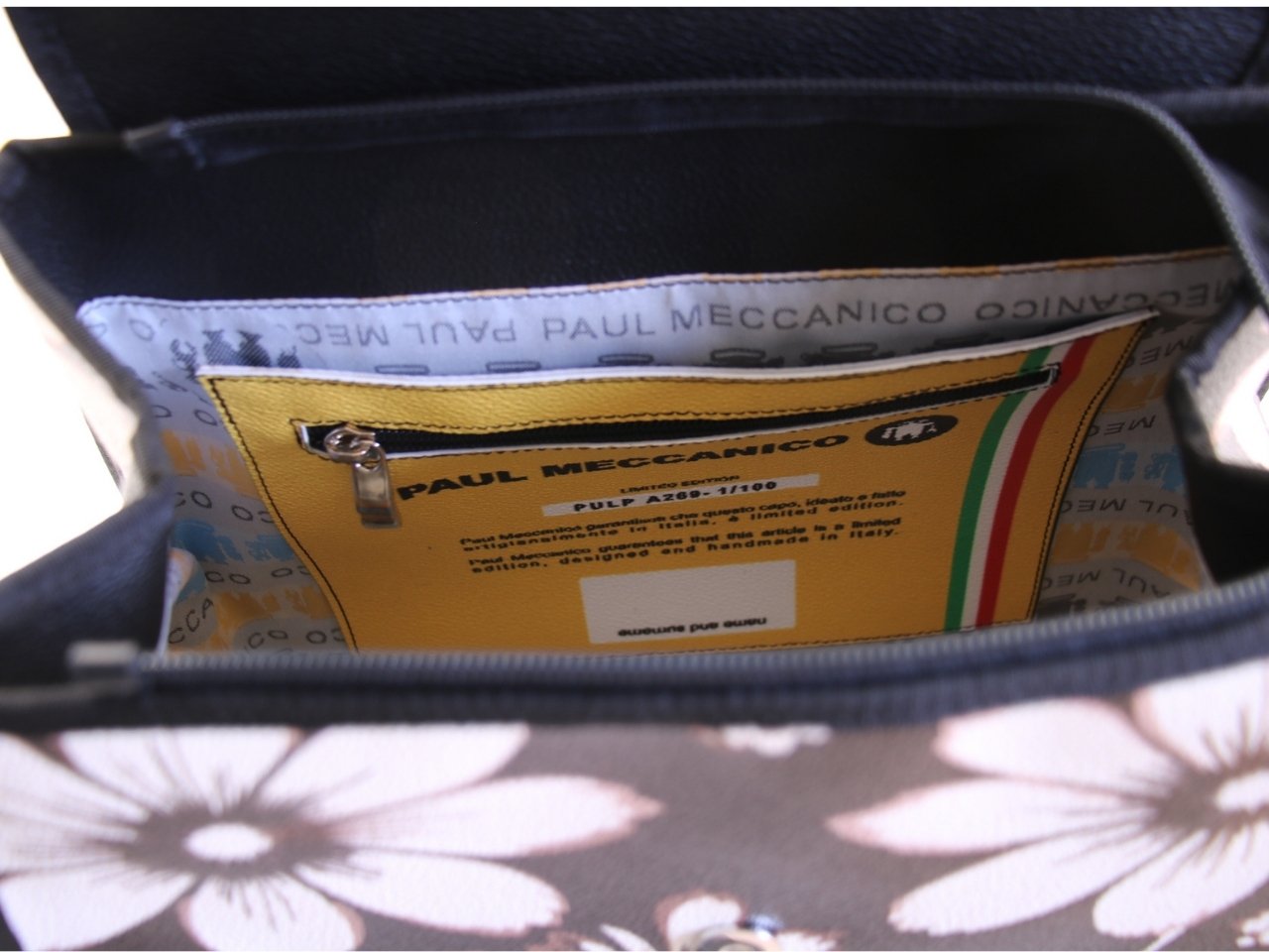 Il tuo pezzo è il N.1 su un totale di 100 borse ed è accompagnato da un Certificato di Autenticità firmato che riporta il tuo Codice di Autenticità e il numero di edizione.