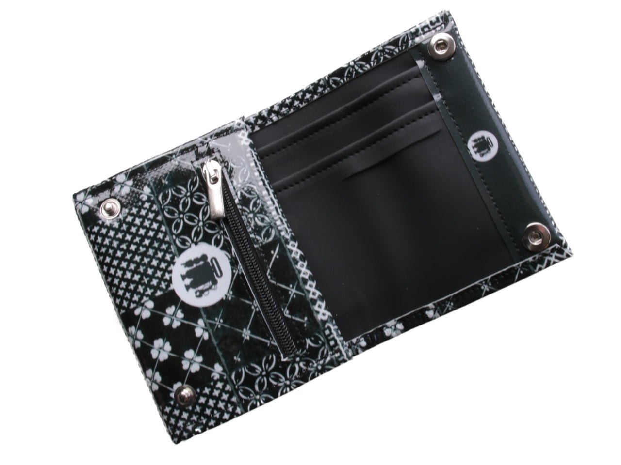 - Interno: Dispone di una tasca interna con chiusura a zip, 2 scomparti per banconote e 4 slot per carte.